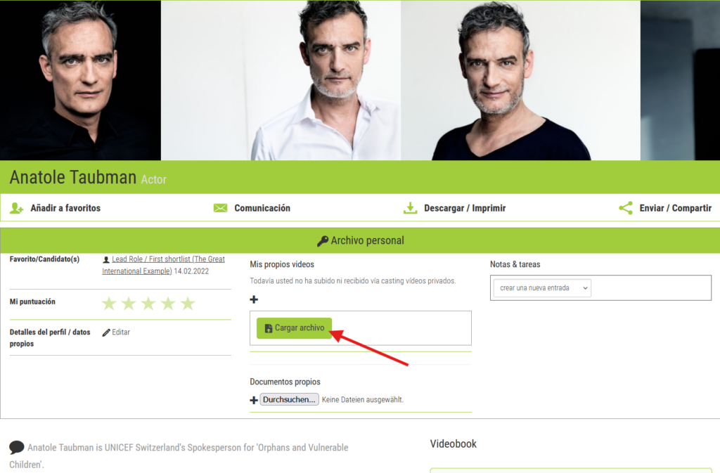 Si ha guardado a un actor como idea/propuesta en un rol, puede enviar un mensaje a ese actor o a su agente a través de la mensajería interna activando la opción «Solicitar un casting de vídeo». También puede escribir el texto del mensaje y añadir la escena como un archivo adjunto. El actor/agente recibirá una invitación para subir un vídeo por usted. El vídeo aparecerá directamente en el cuadro «Medios». Así se ahorrará desvíos a través de WeTransfer, correo electrónico, etc.