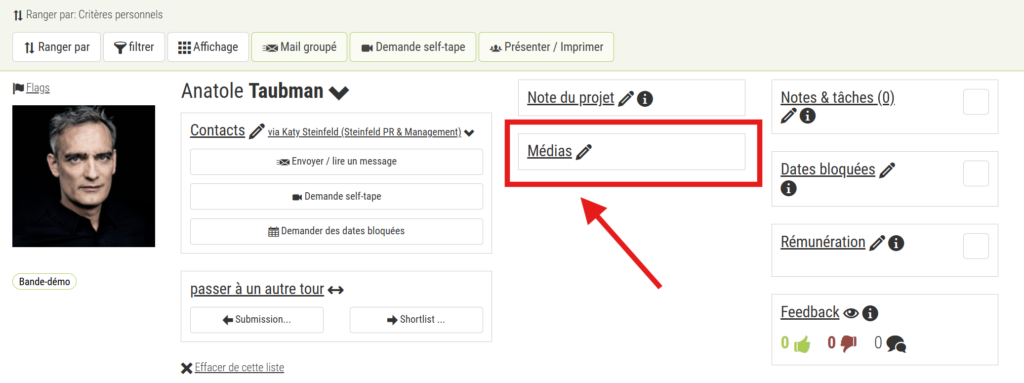 Si vous avez enregistré un comédien comme idée/proposition dans un rôle, vous pouvez envoyer un message à ce comédien ou à son agent via la messagerie interne en activant l’option « Demande self-tape ». Vous pouvez encore écrire un texte de message et ajouter la scène en pièce jointe. Le comédien/agent reçoit alors une invitation à télécharger une vidéo pour vous. La vidéo apparaît directement dans la boîte « Médias ». Vous évitez ainsi les détours par WeTransfer, e-mail, etc.
