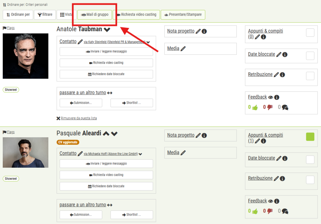 Utilizzate la funzione “mail di gruppo” per inviare lo stesso messaggio a più destinatari. Per personalizzare i messaggi, è possibile utilizzare le seguenti variabili, che vengono sostituite automaticamente all’invio del messaggio: [NAME] – Nome del destinatario [ROLE] – Titolo del ruolo [PROJECT] – Titolo del progetto. Le variabili devono essere scritte in maiuscolo e con le parentesi quadre come specificato.