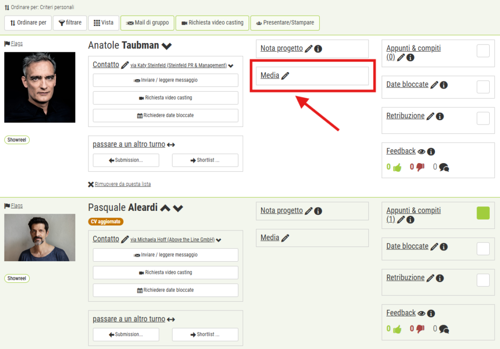 A tale scopo, utilizzare le “Flags” sopra la foto dell’attore nell’elenco. È possibile definire Flags individuali per ogni progetto, con un titolo e una selezione di colori. È anche possibile contrassegnare una persona con più Flags e filtrare in base alle Flags, ad esempio per visualizzare solo le persone con lo stato “Disponibile” o “retribuzione chiarita”.