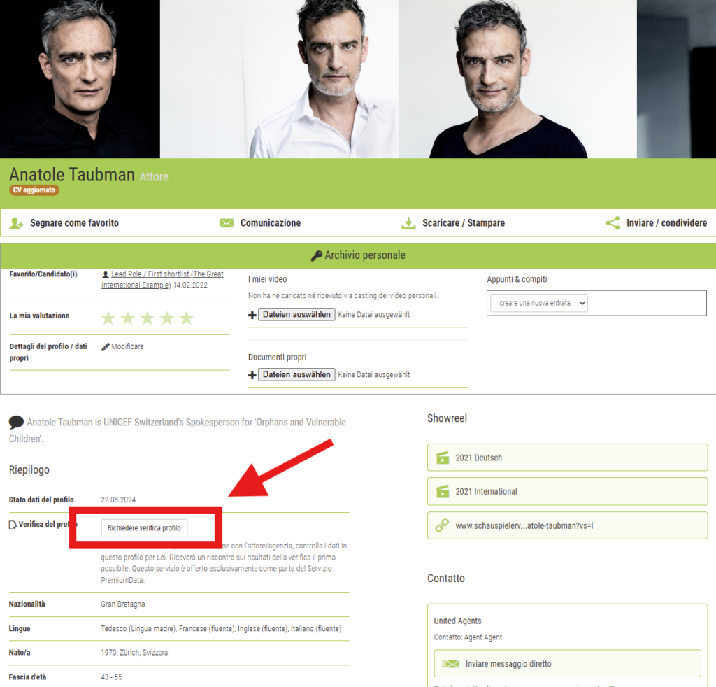 Ci sono diverse opzioni: potete utilizzare la messaggistica interna o i dati di contatto forniti e chiedere alla persona di completare il profilo. È anche possibile utilizzare il pulsante “Richiedere verifica profilo” e lasciare un messaggio. Queste informazioni saranno inviate alla nostra redazione e organizzeremo il materiale richiesto in collaborazione con l’agenzia o l’attore.