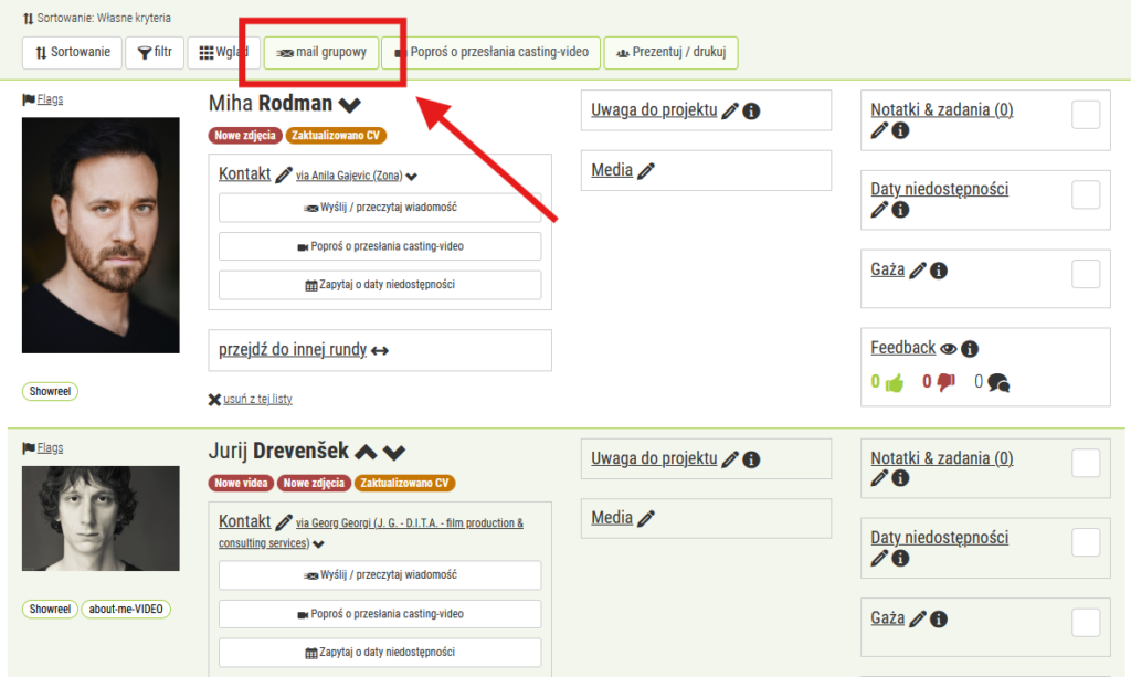 Skorzystaj z funkcji “mail grupowy”, aby wysłać tę samą wiadomość do kilku odbiorców. Aby spersonalizować swoje wiadomości, możesz użyć następujących zmiennych, które są automatycznie zastępowane podczas wysyłania wiadomości: [NAZWISKO] – Nazwa odbiorcy [ROLA] – Tytuł roli [PROJEKT] – Tytuł projektu. Zmienne muszą być zapisane wielkimi literami i w nawiasach kwadratowych, jak określono.