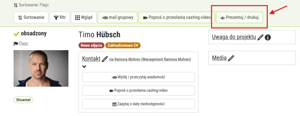 Aby to zrobić, użyj opcji „Flagi” nad zdjęciem na liście. Możesz zdefiniować indywidualne flagi dla każdego projektu, z tytułem i wyborem koloru. Możesz także oznaczyć osobę kilkoma flagami i filtrować według flag, np. aby wyświetlić tylko osoby ze statusem „Dostępny” lub „Gaża wyjaśniona”.
