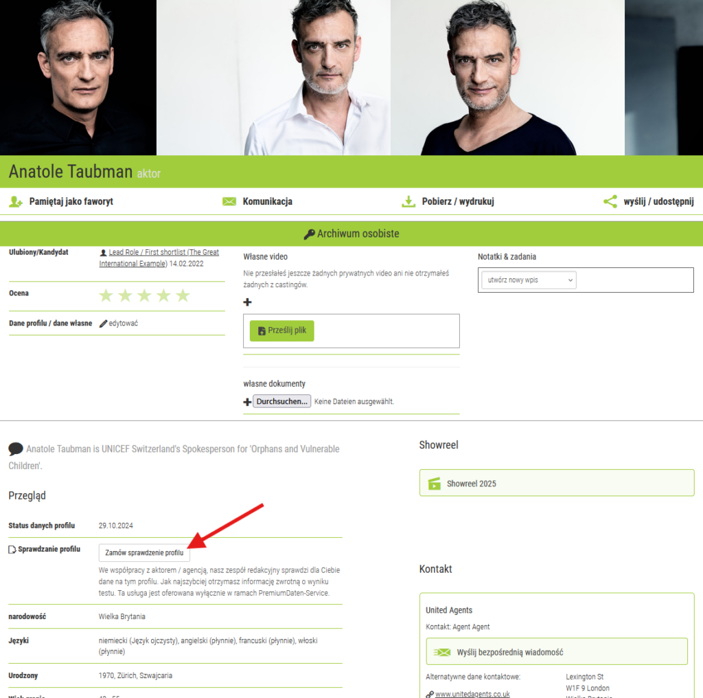 Istnieje kilka możliwości: skorzystanie z wiadomości wewnętrznej lub podanych danych kontaktowych i poproszenie danej osoby o zaktualizowanie profilu. Możesz też użyć przycisku „Sprawdź profil” i zostawić wiadomość. Informacje te zostaną przesłane do naszego zespołu redakcyjnego, a my zorganizujemy pożądany materiał we współpracy z agencją lub aktorem.