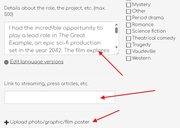 • Descriptions: Add details about your work with the director or your role.